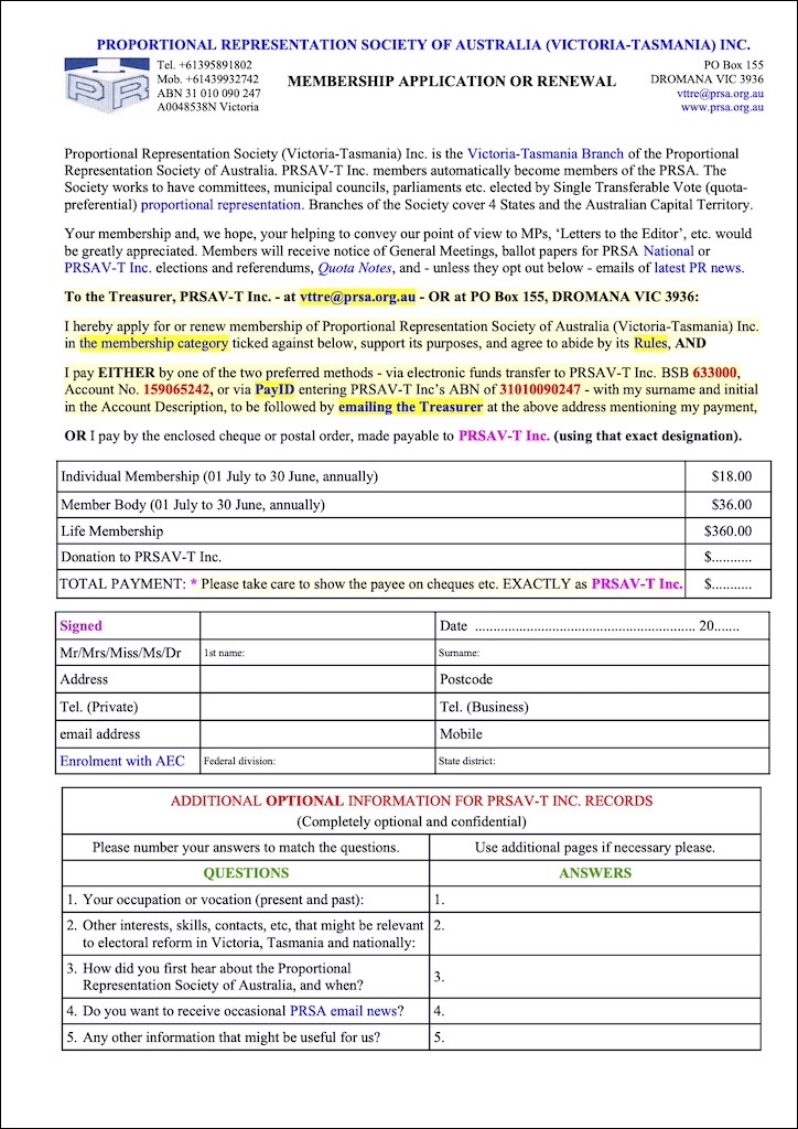 Supporters are also welcome to donate to the Proportional Representation Society of Australia (Victoria-Tasmania) Inc. branch using the banking details shown on the form above.